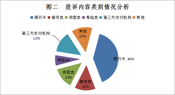 银行卡类咨询投诉主要有银行卡代扣缴费数额与客户预期有出入引争议;客户存折被冻结致医保扣费失败;业务经理在销售过程中未对产品进行充分解释,造成消费者在非自愿的情况下办理信用卡等等。金融机构服务类投诉咨询基本上属于较常见的问题,工作人员服务态度欠佳,服务质量达不到消费者预期需求等等。贷款类涉及的是消费者对保费与利息的概念了解不清晰,引起还款利息的争议。保险业方面的投诉,主要还是以银保产品业务投诉为主,如业务员夸大预期收益、中途退保争议以及消费者对保单内容不熟悉等等。