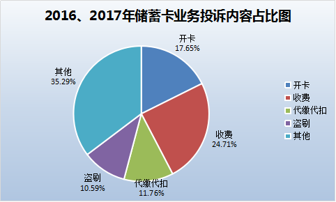银行卡类投诉主要集中在储蓄卡及信用卡业务。从近两年受理的储蓄卡投诉情况看,主要涉及开卡开户、卡片收费、代缴代扣及卡片盗刷等方面,内容包括:消费者开户被强制要求存款、储蓄卡年费及业务手续费争议、储蓄卡出现不明扣款及遗失卡因开通小额免密支付功能被盗刷等问题。
