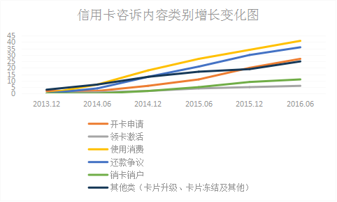 据联合会统计,信用卡咨询投诉内容涉及开卡申请、领卡激活、使用消费、还款争议及销卡销户环节五个环节。其中使用消费和还款争议分别占信用卡咨询投诉的27.89%和24.49%,是最为集中的两大环节(见图一)。综合图二,涉及使用消费、还款争议、开卡申请的咨询投诉增长直线上升,幅度较大,需金融机构重点关注。